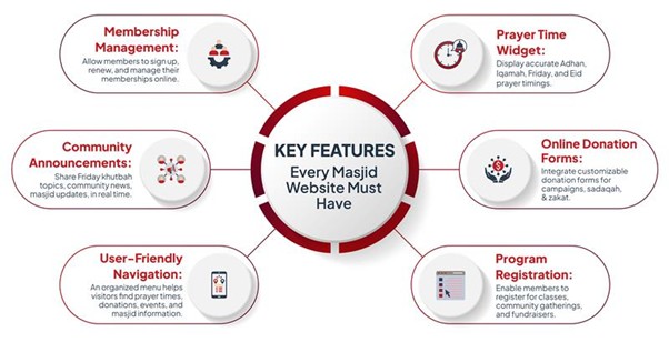 Essential mosque website features include prayer time widgets with Adhan and Iqamah schedules, online donation forms, event and program registration, a membership portal, Hijri date display, an announcements section, and clear mosque website navigation.