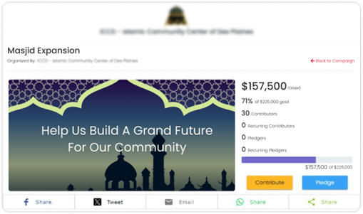A special Ramadan virtual fundraising campaign designed for daily giving throughout Ramadan. Masjids can run iftar drives, Zakat appeals, or community support projects with global reach. Real-time tracking, storytelling, and easy sharing tools help boost engagement. It ensures your masjid can collect flexible daily donations online throughout the blessed month.