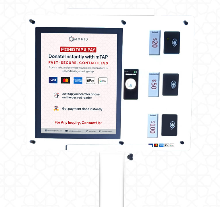 mTAP Frame and mTAP Lite are now available for order. It supports Apple Pay, Google Pay, and Tap cards, offering fast and secure donations fully integrated with your MOHID dashboard.