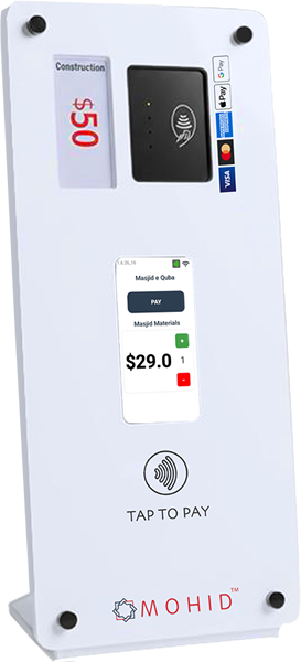 mTAP Frame is a portable and convenient tap-to-donate device with flexible donation amounts. It is perfect for high-traffic Masjid areas like entrances, hallways, or exits.